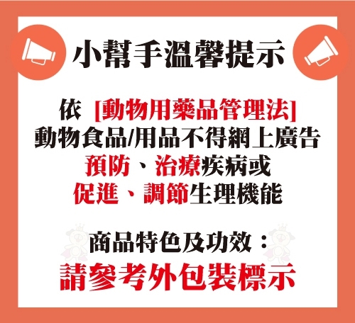 因「動物用藥品管理法」之規定,不得網上公告 預防/治療疾病或促進/調節生理機能之標示